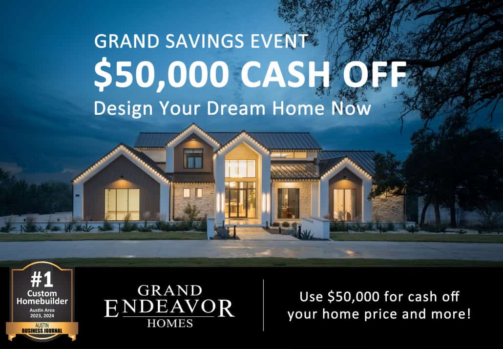 Flex cash can only be used in one of the ways offered, including reduction in purchase price (not being less than base price of home) or buying down the interest rate (specific interest rate and associated APR fluctuate on a daily basis and change due to individual situations). Your rate will depend on various factors including loan product, loan size, credit profile, property value, geographic location, occupancy and other factors. These rates are not guaranteed and are subject to change. Offer is for a limited time only and can be stopped at any time and with no prior notice. Cannot be combined with any other offer. Exclusions may apply. All eligible sales must be original new contracts with Grand Endeavor Homes signed by May 31, 2026. Offer valid only for new contracts and does not apply to transfers, cancellations or rewrites. No cash value. Unused portions of the flex cash will be forfeited.