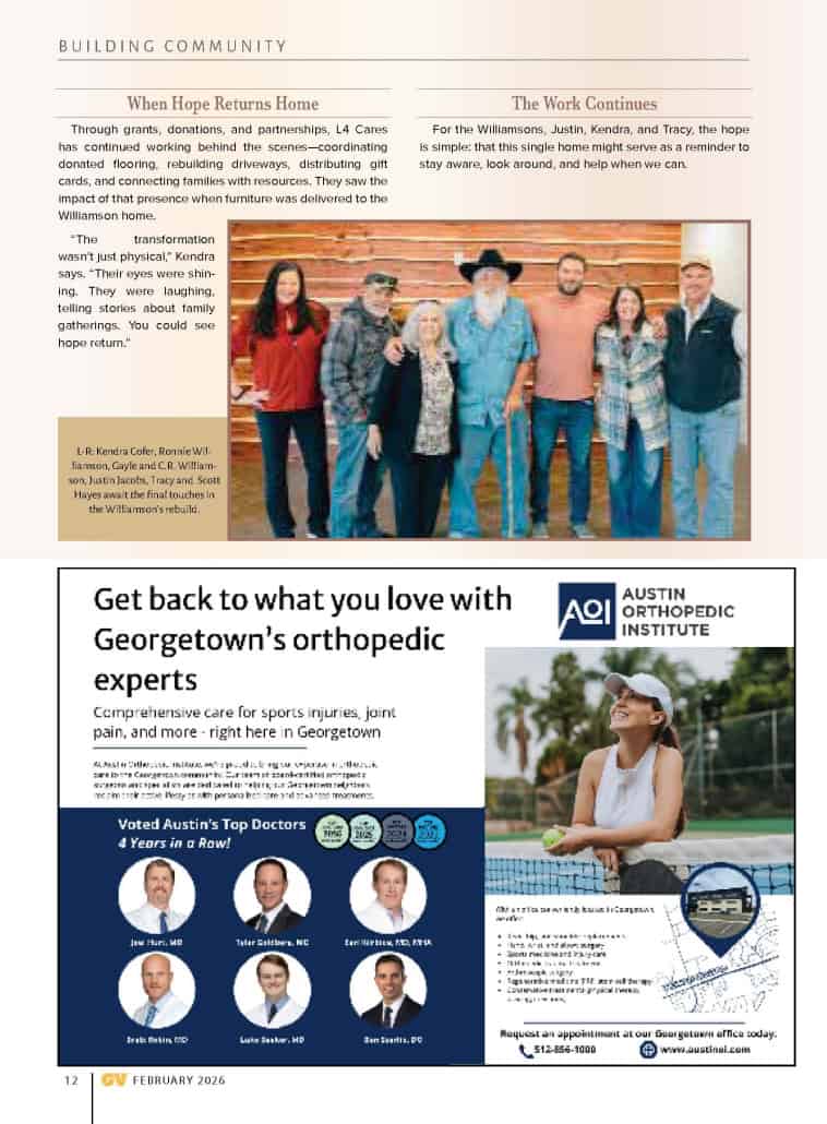 In 2025, our President, Justin Jacobs, rebuilt the home of a family who lost everything in the Central Texas floods. The Georgetown View published a story about this effort in their February 2026 issue.